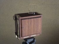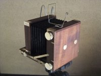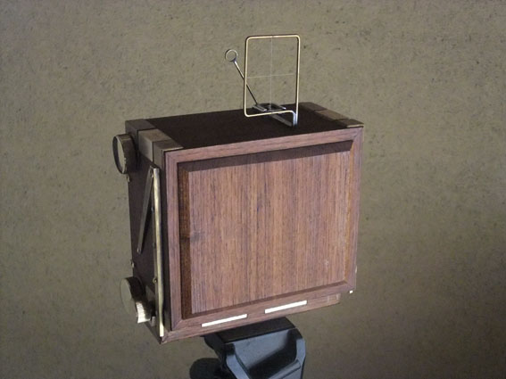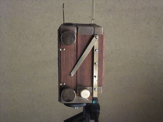 折り畳んだ状態 レンズボード部繰り出しのガイドレール固定用の襷を前蓋の固定にも使える様に設計した。 |