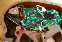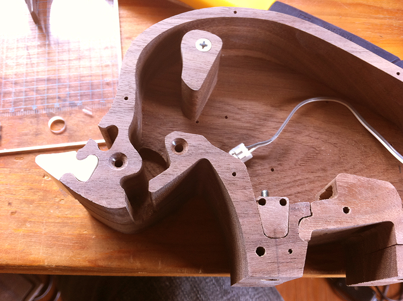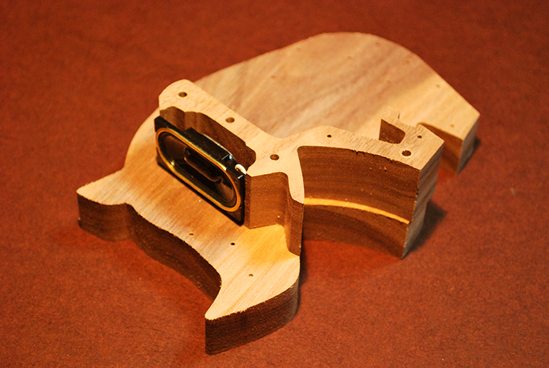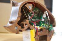 頭の方をなでれば高い音、おしりのほうをなでると低い音が鳴ります。背中にはタッチセンサ、おなかの部分には電子回路や電池が入っていて、サイの外形はもちろん、内部を構成する細かい部品の削りだしにもmini-CNC PRX 1510を使っています。仕上げの形作りや磨きを手で行い、持ち心地や肌触りを追求しています。
