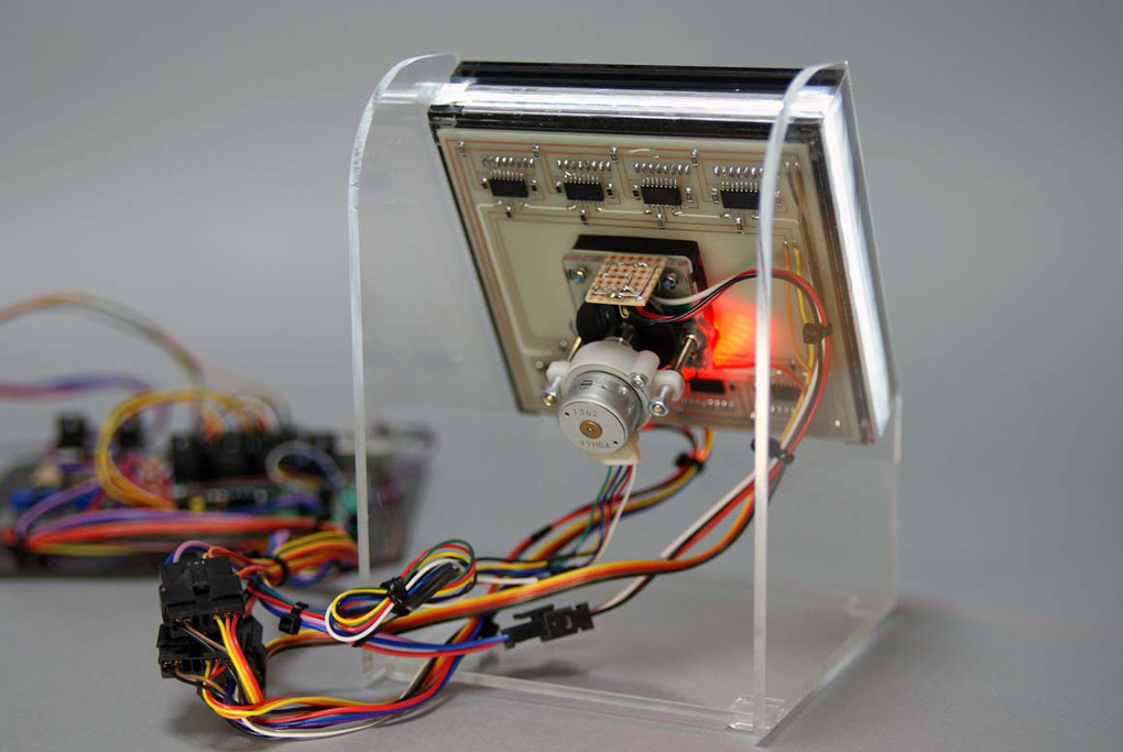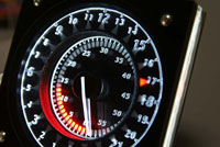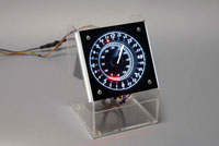 電飾については、文字盤はアクリル板にエッジライトで数字を表示し、赤い目盛りは、直接裏から赤いLEDで点灯しています。指針は、針の根本からLEDで照明を入れていますが、電源供給のために、スリップリングを入れています。次作では、一般的な自動車のメーターのように、導光板を使って、スリップリングを不要にしたいと考えています。