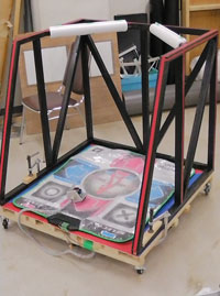 『DDR CAR』という名前の通り人が乗ってDDR専用コントローラーで動きます。オムニホイールで前後左右移動はもちろん、斜め移動や左右旋回もできます。2012年の