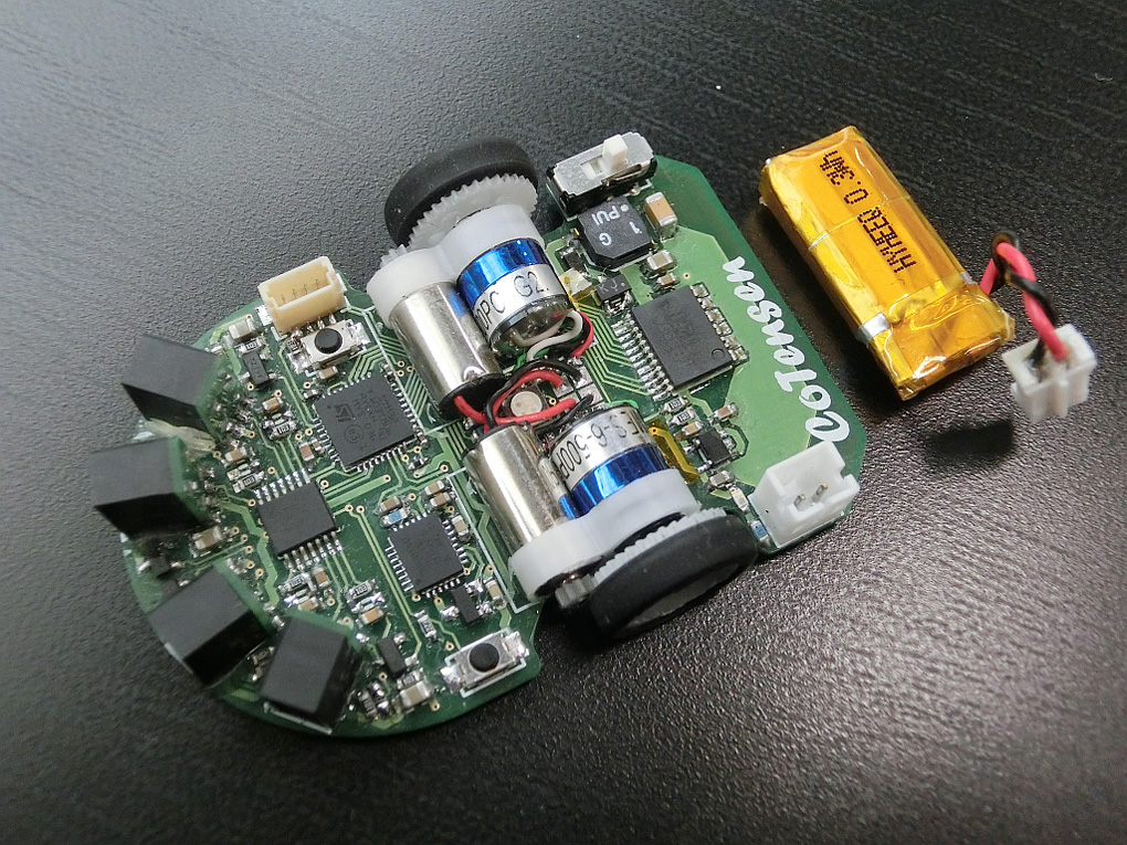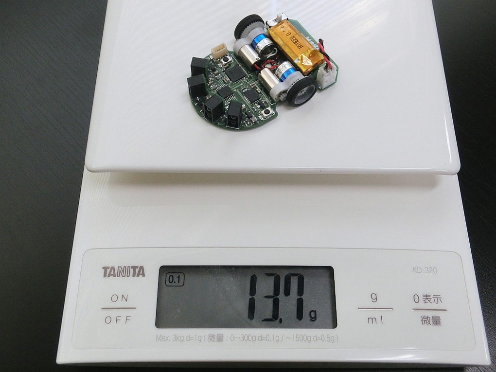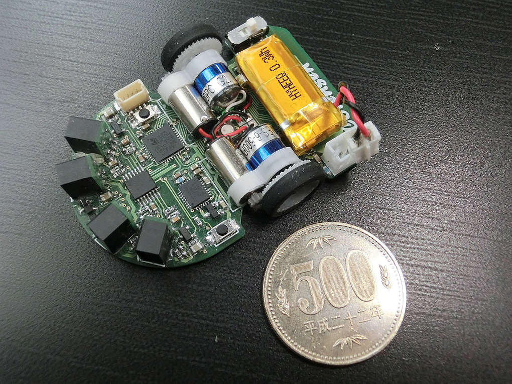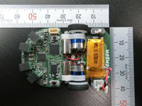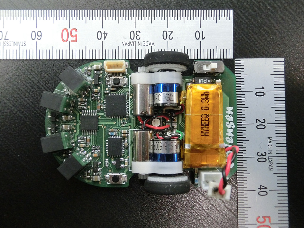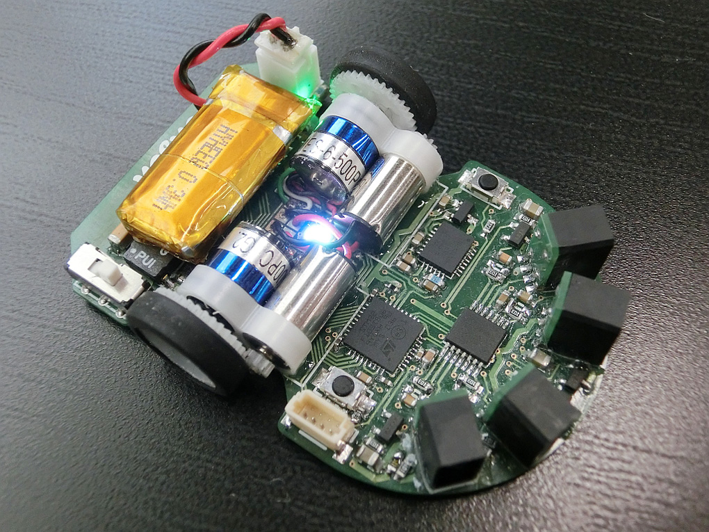 高い計算能力をもったマイコンとセンサやモータドライバを搭載した基板上に駆動系を乗せて走行しますので、基板が走るという光景は異様かもしれません。 部品製作、基板設計、電子部品実装とどれをとっても油断のできない作業で大変でした。