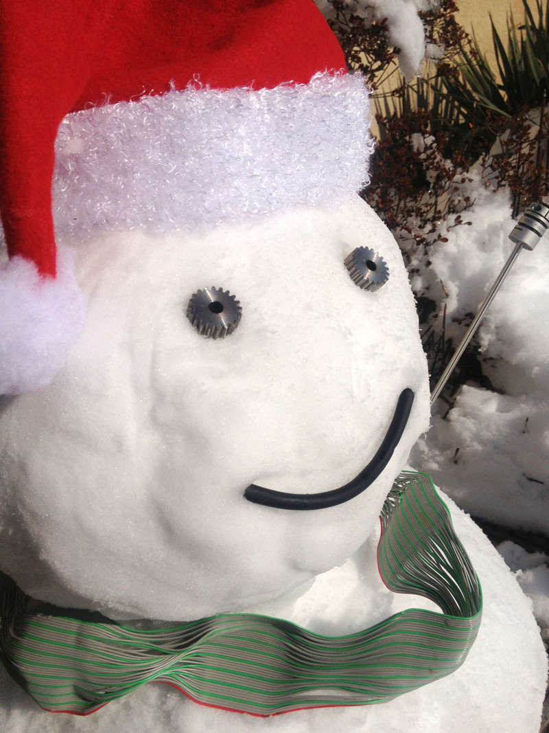 あどけなさを演出するために目に歯車を使い、ニッコリとした表情にするために、口にはカールのかかったロボットケーブルを使用しました。そうしてつくっている内に愛着が湧いてきてしまったので、防寒対策としてマフラーの代わりにフラットケーブルを首元に巻いて上げました。これで寒い冬も安心です。あどけなくも上向きな顔が、明日への希望を感じさせてくれます。
