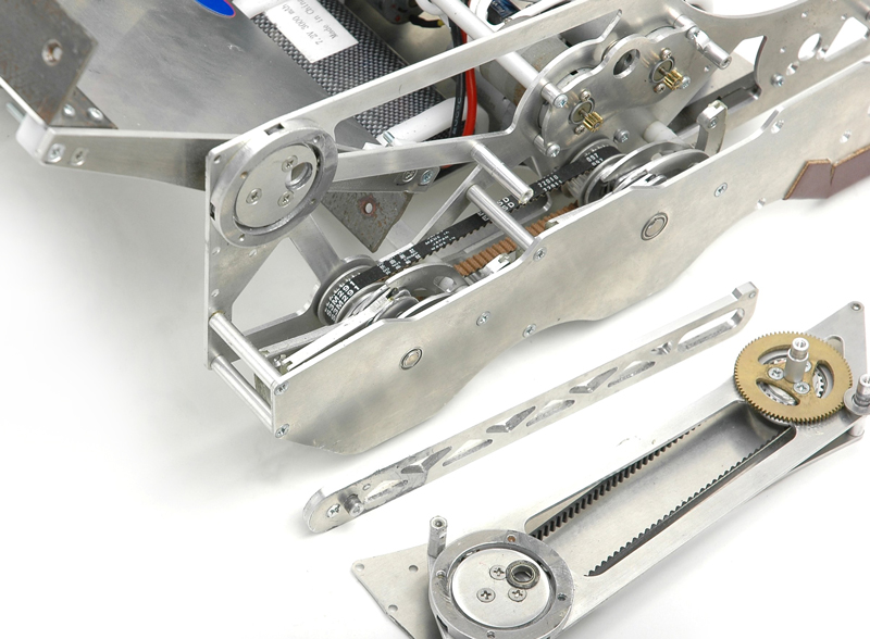 今回一番頭を使ったアームの機構部分です。 ルール上、アーム(攻撃部分)に一番近い動力伝達部分にリンク機構を搭載しなければいけません。 |