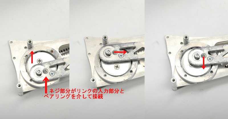 スライダーリンク機構を搭載しています。 ただリンク機構といえばリンク機構ですが、軸のずれているシャフトで入力と出力を繋いでいるだけです。 |