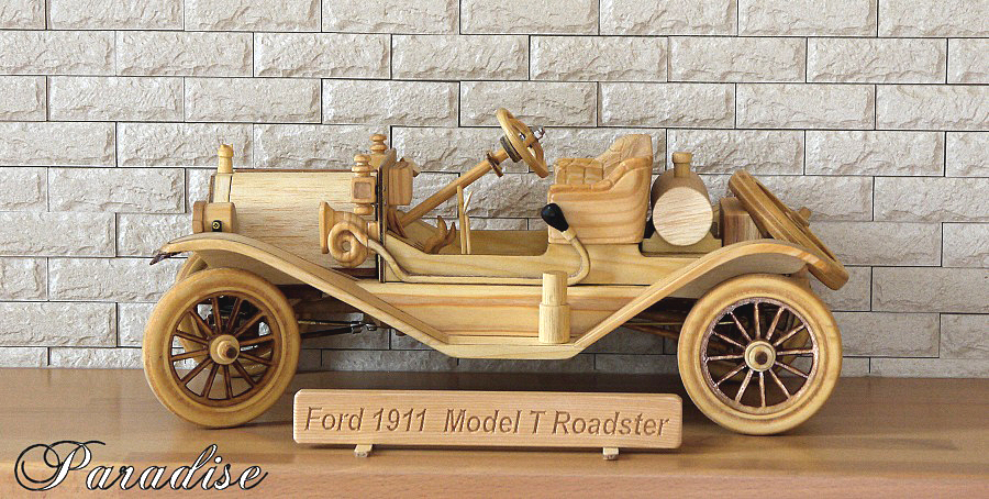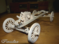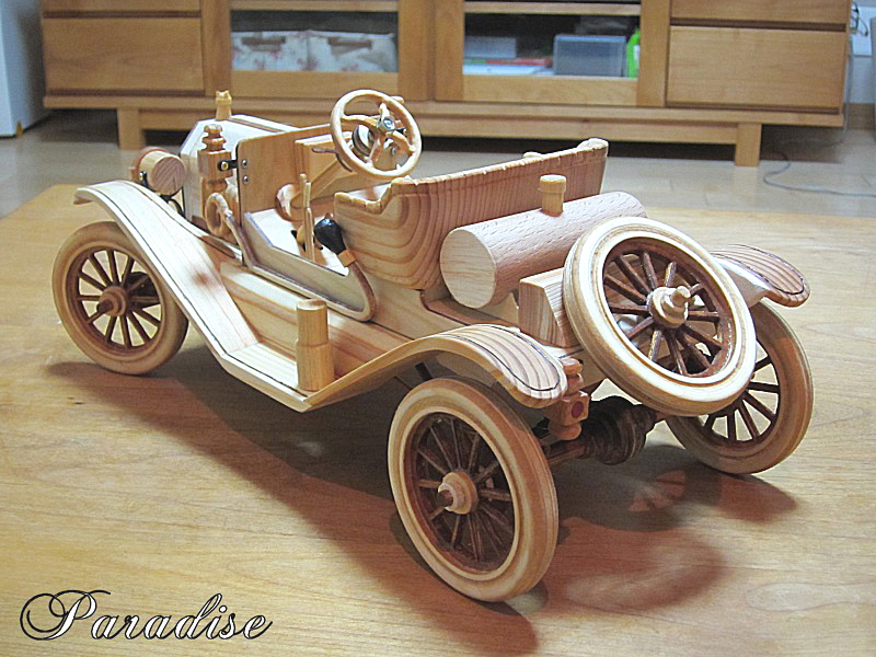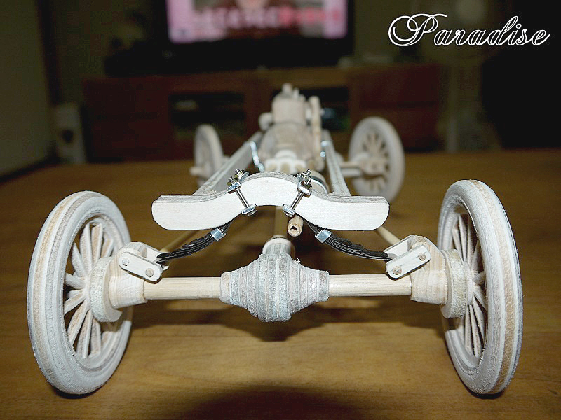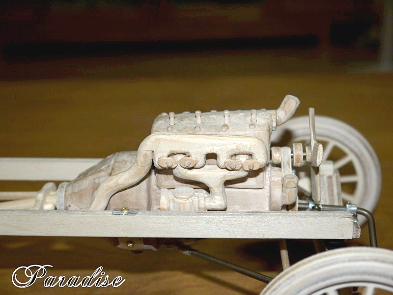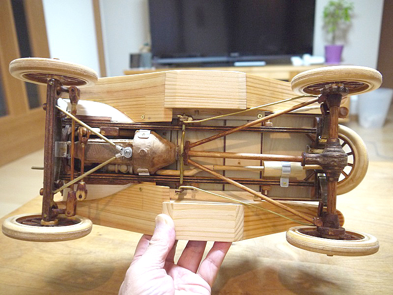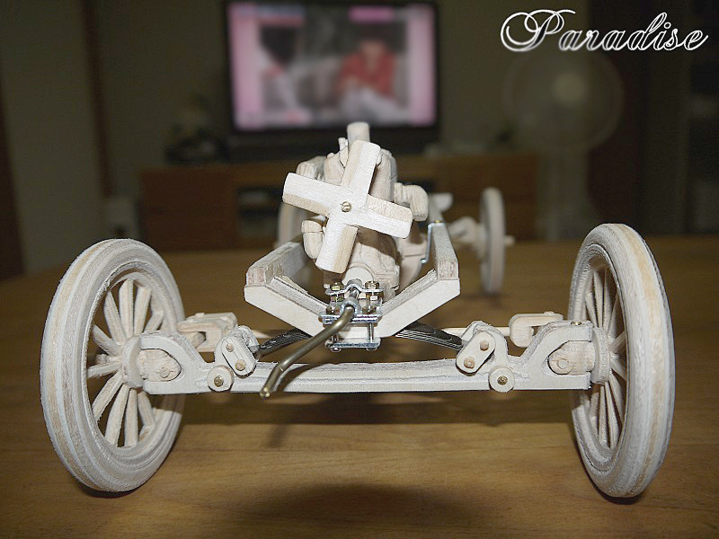 木の模型と言ってもボンネットを開けるとエンジンが載っていてハンドル操作は勿論、サスペンションまで忠実に再現してみました。