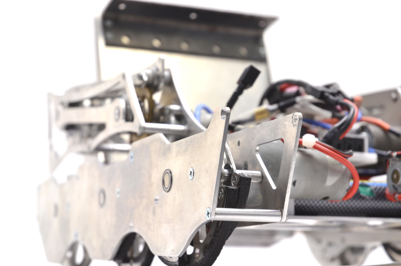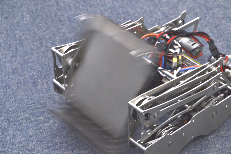 ロボット先端の回転する部分、俗にいう回転アームで相手を上向きに弾いて転倒させます。
