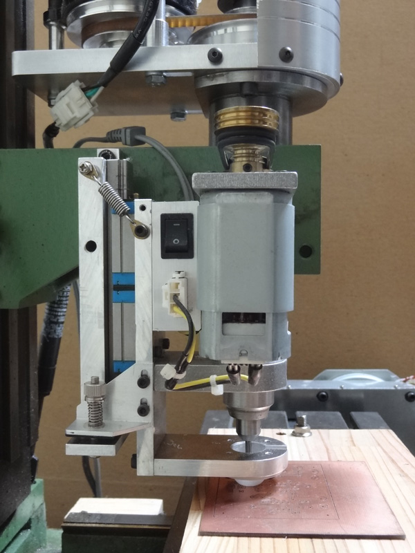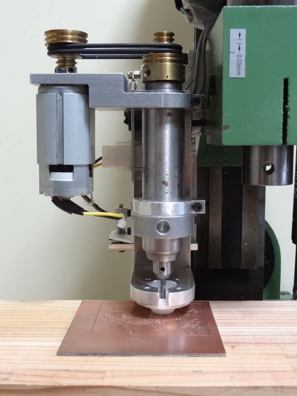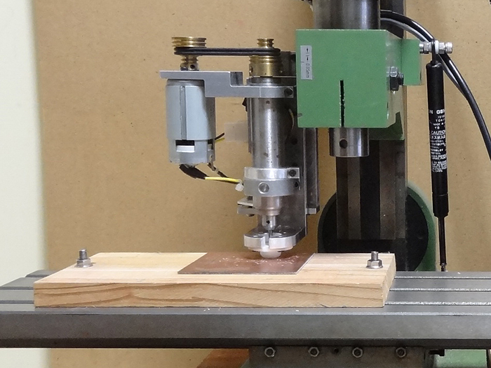 X1フライスはZ軸のバックラッシュが非常に大きいので、精密な切込みができません。フローティングヘッドにすればヘッドが基板表面を滑動するので、バックラッシュと無関係になり、基板の反りも無視できます。
