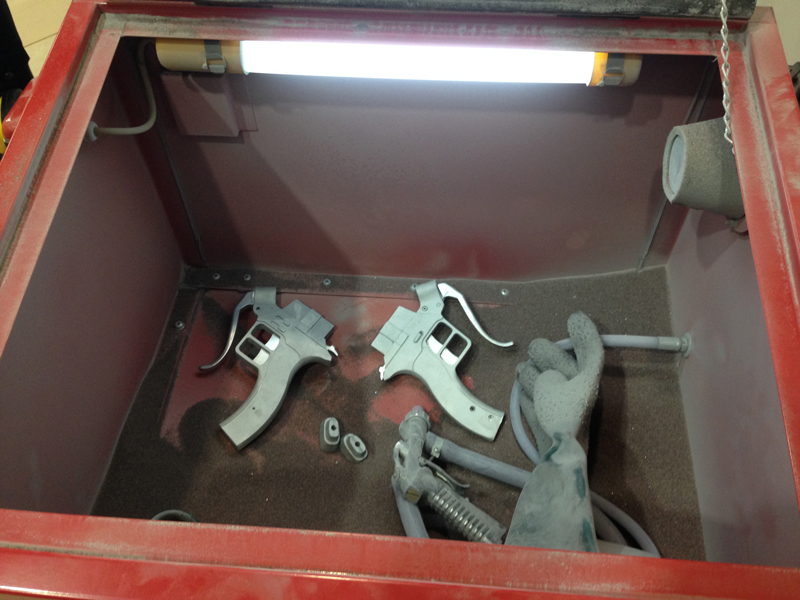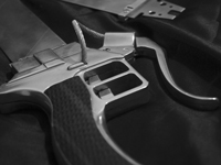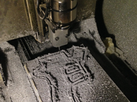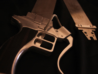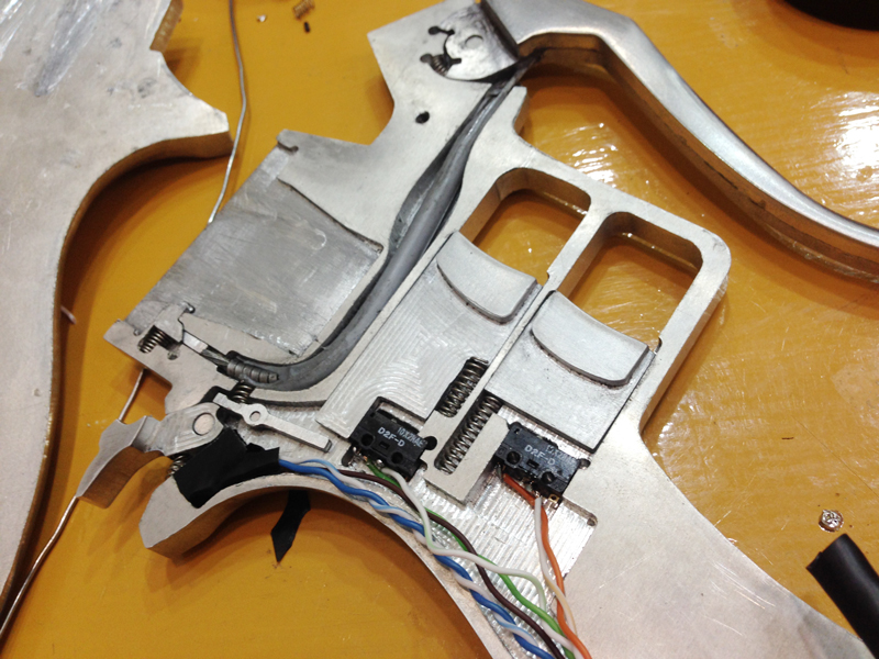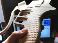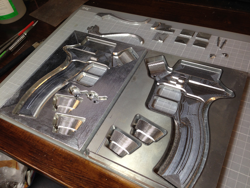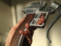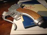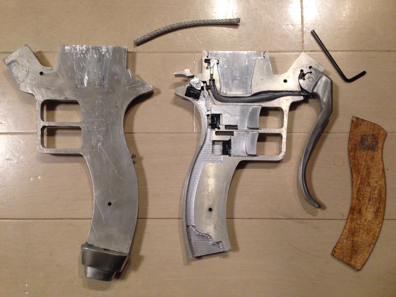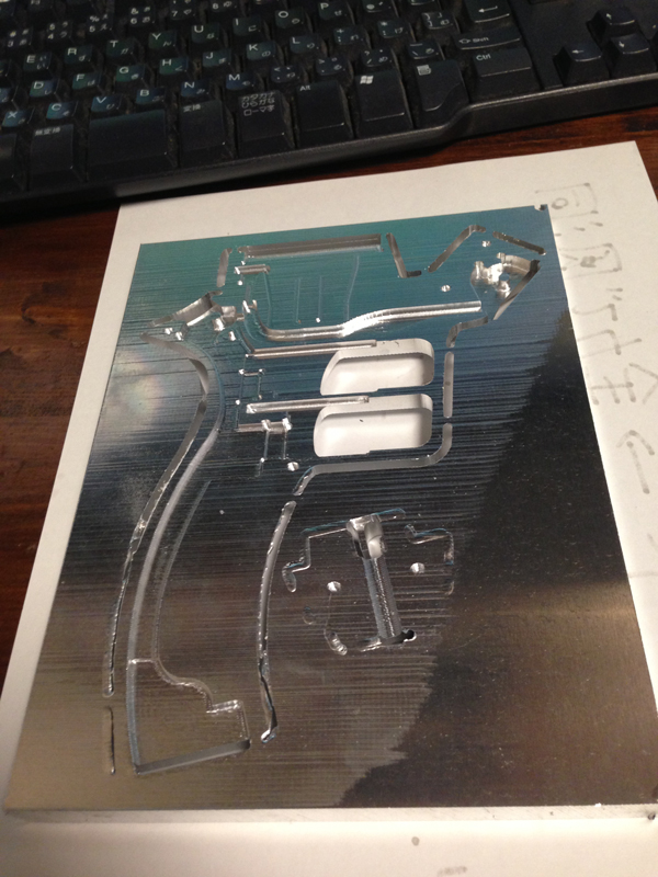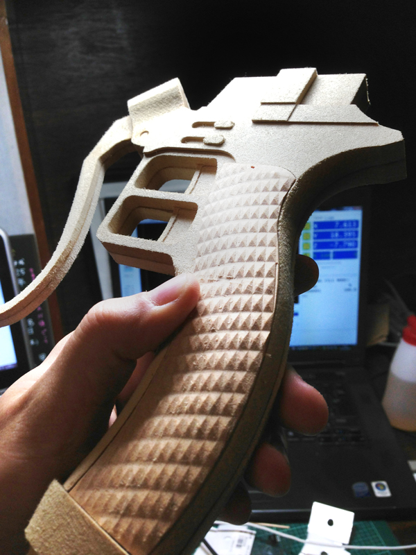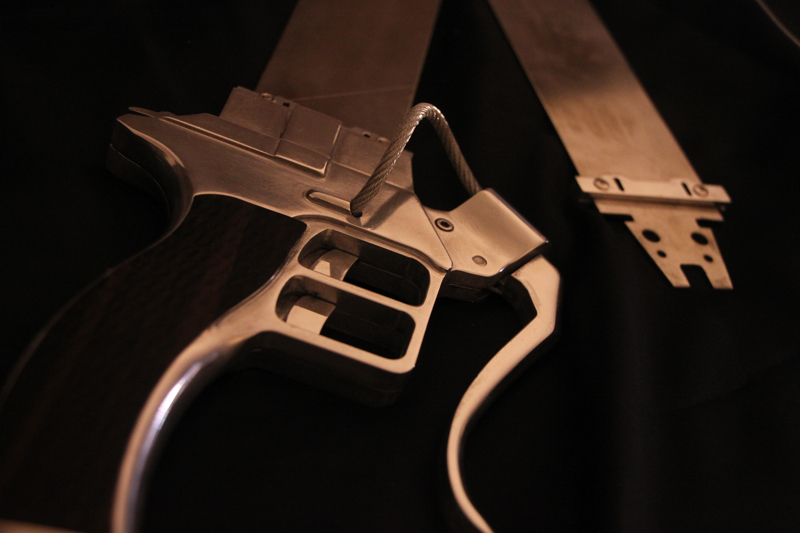 本体はKitMill BT200によるアルミ削り出しで、持つとひんやりとした金属の冷たさとずっしりとした重量感が伝わってきます。ブレードは1.5mm厚のステンレス板を使用しており、剣全体の重量はおよそ800g。スイッチングやコックレバーの動作、レバー操作によるブレードの着脱など、全ての動きを再現し、中に電子スイッチを仕込むことで外部への信号の出力が可能になっています。立体機動装置の本体は別途開発中です。本体完成後はこの剣のスイッチからの信号でガスが噴射されたり、アンカーワイヤーが発射されるなどのアクションを制御できるようになります。