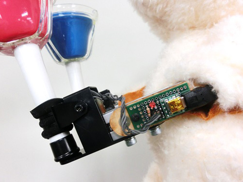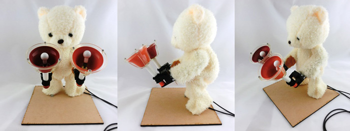 この骨格にくまさんのぬいぐるみを加工した外装をかぶせることで、写真4のようなかわいいくまさんロボットが出来上がります。