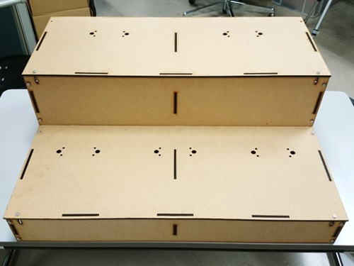 レーザーカッターで切り抜いたMDF板をボルトで結合して箱組することで、ステージを作成しています。