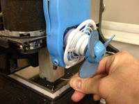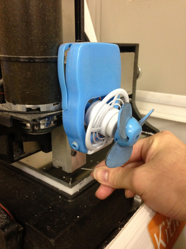 100円均一で購入したファンにミニ四駆用のモータ「ハイパーダッシュ3モータ」を搭載し、切粉を飛ばしながら加工している様子です。