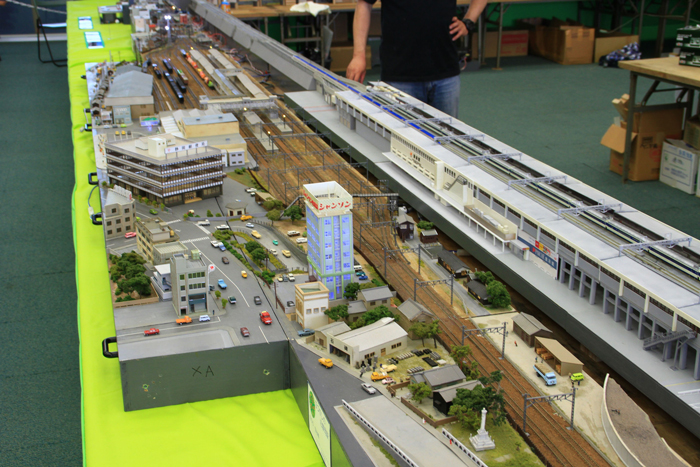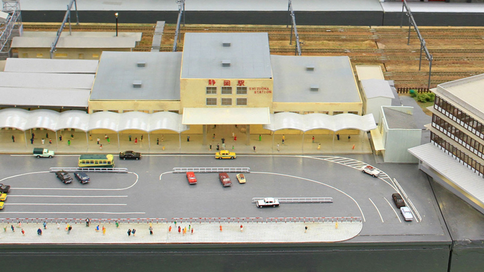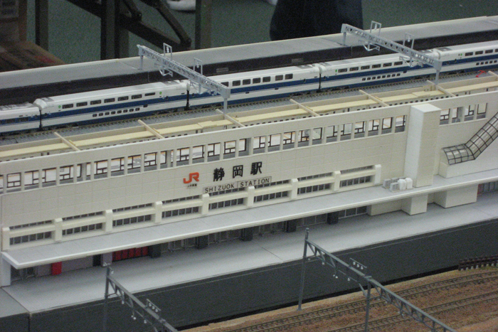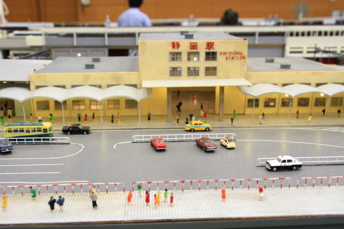 旧静岡駅付近のジオラマです。右斜め上新幹線静岡駅はお客様に見えるよう逆に置いてあります。