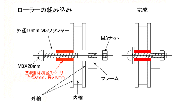 フレームとローラーとモーターの配置図