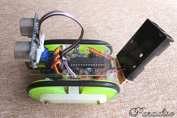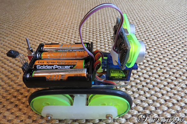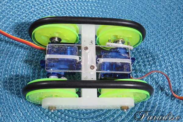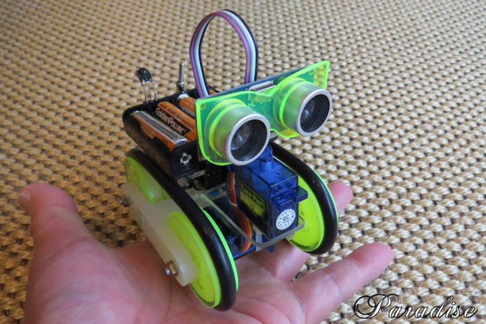手のひらに載る超小型無限軌道車です。小さいですが超音波センサーによる自律走行とテレビのリモコンを使っての手動運転が出来ます。駆動モータにマイクロサーボモータを連続回転に改造して使いました。