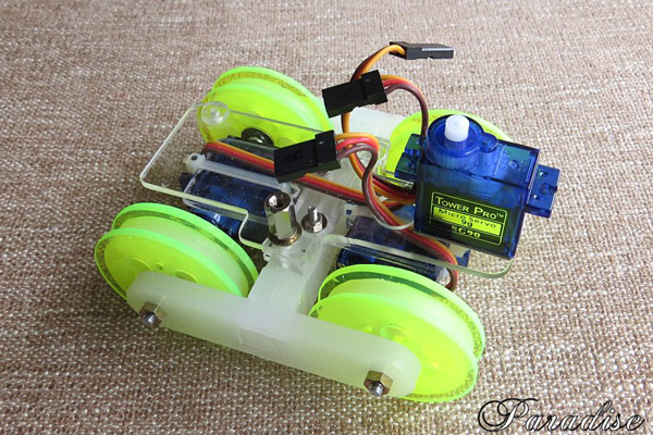 マイコン基板や超音波センサー用サーボモータの取り付け用アクリル板の設置のようす。