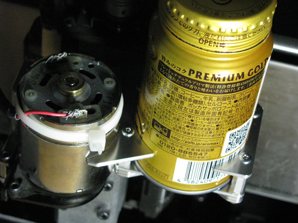 冷却水用のコーヒー缶(同じサイズならコーンスープ缶でもOK/図面データを添付していますので、近いサイズの缶でしたら直径データを変えてもらってもOKです)を取り付けた状態です。缶が温まったら中のお湯を捨てて、水道水を入れてフタをしっかり閉めてセットします。