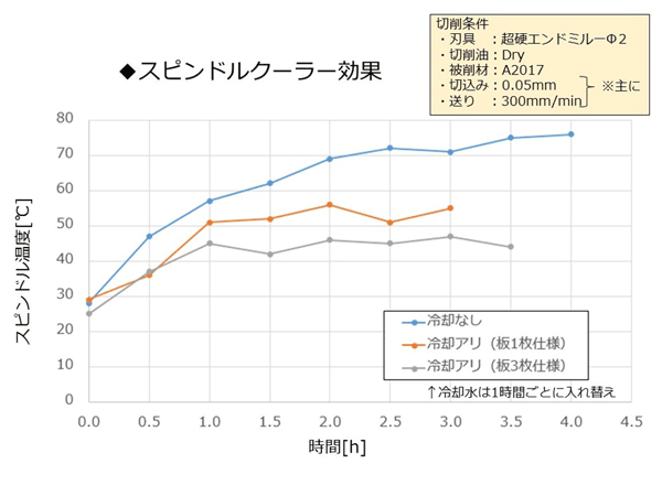 冷却効果です。温度はスピンドルモーターの胴回りを放射式温度計で測定しています。
