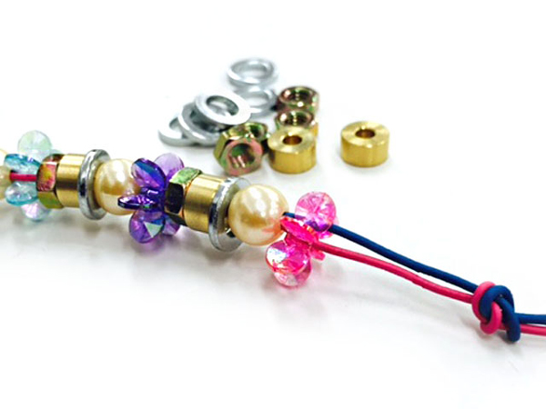 電線にビーズやナットやワッシャーなど機械部品を入れました。 花の形のビーズから、銅線が透けて見えるのもポイントです。
