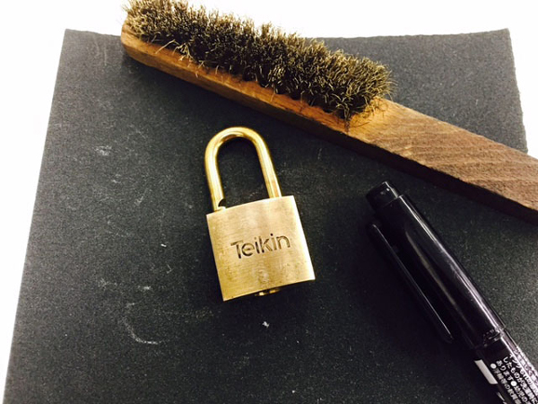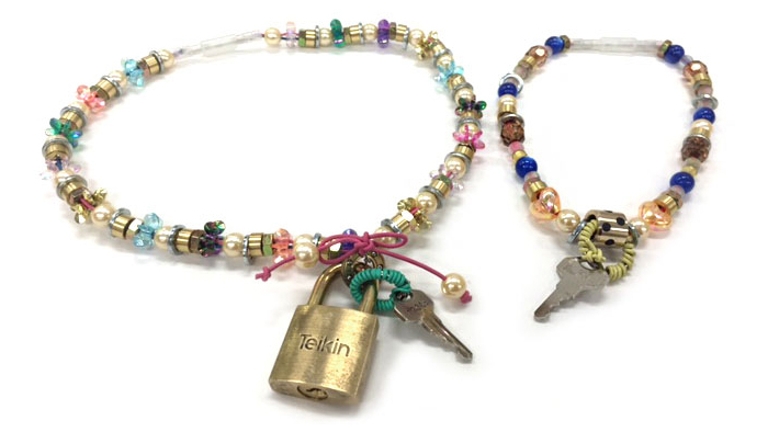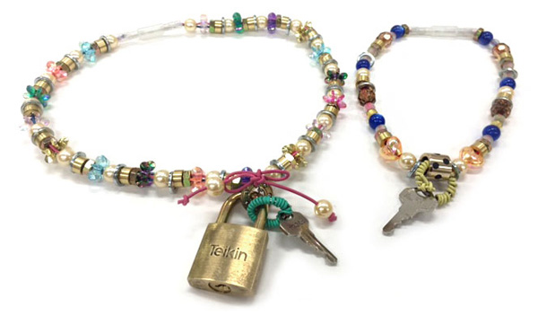 南京錠をつける金具には機械部品を、リボンやカギを付けた金具には電線を使いました。