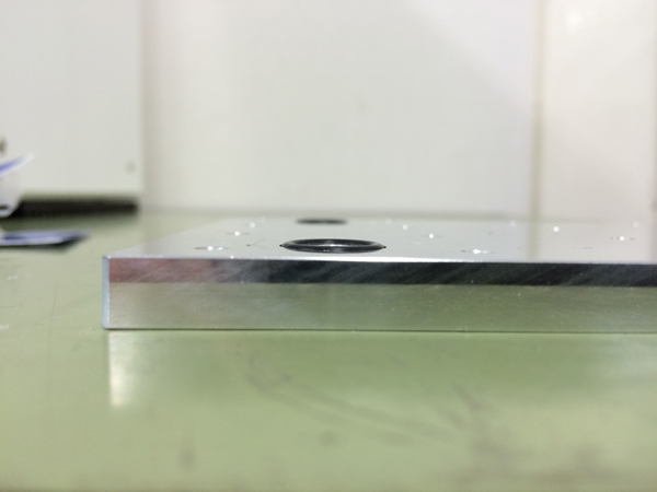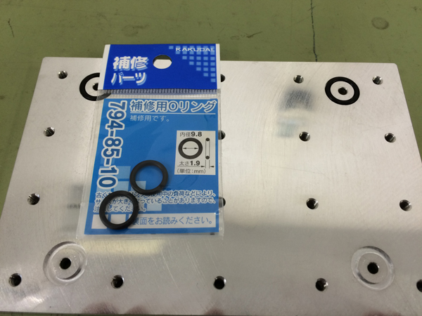 クーラントで両面テープがはがれてしまうので、オプションのアルミ製加工テーブルとクランプを用いて固定します。そのまま固定すると、クーラントが漏れてくる心配があったので、ゴム製のOリングを取り付けます。うまいことOリングがはまるような溝を追加工しました。