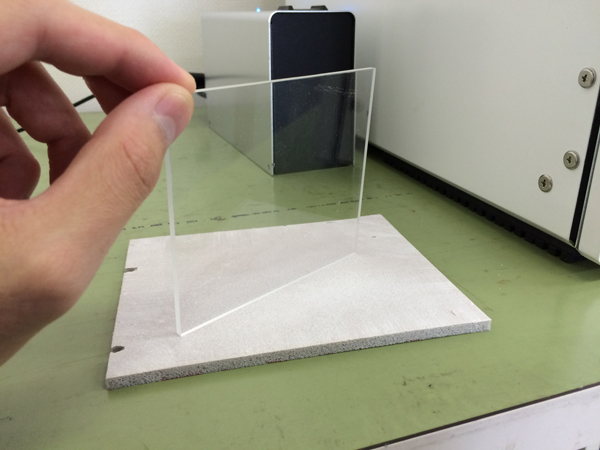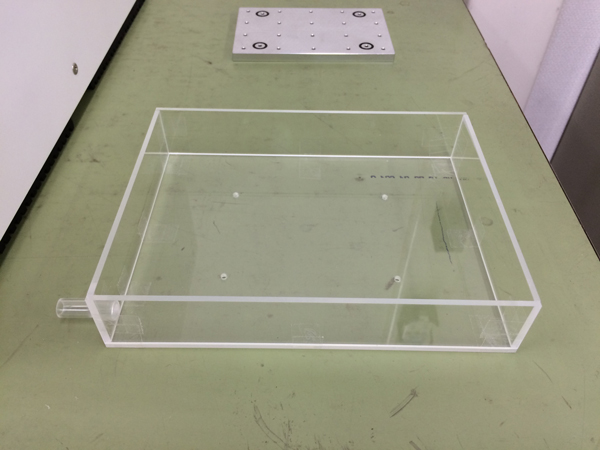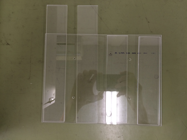 材料はT=3のアクリル板です。ホームセンターで切ってもらい、穴をあけました。箱上に組むので、そこそこ精度を出すようにお願いして切ってもらいました。面倒な場合は、アクリル加工屋さんに頼むのが一番手っ取り早いと思います。