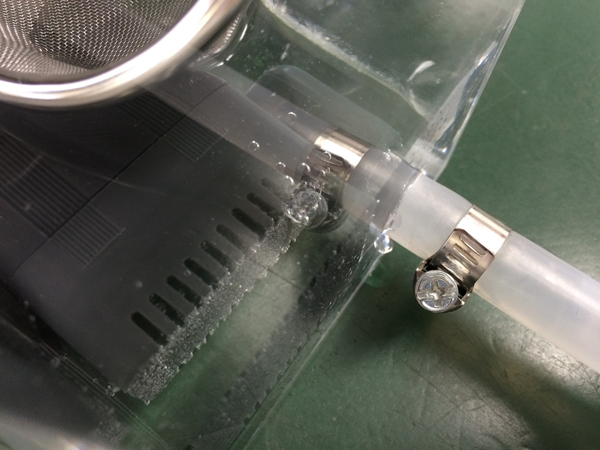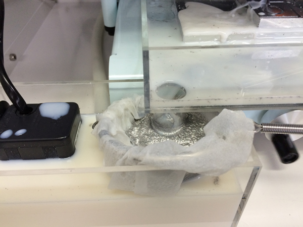 流れてきた切粉がここに溜まります。茶こしだけでは切粉が流れて行ってしまったので、キムワイプをフィルター代わりにしています。キムワイプは溶けださないし水の通りが良い、切粉が捨てやすいのメリットがありました。隣に見えるのが、水槽用のポンプです。このサイズながら、流量は十分でした。