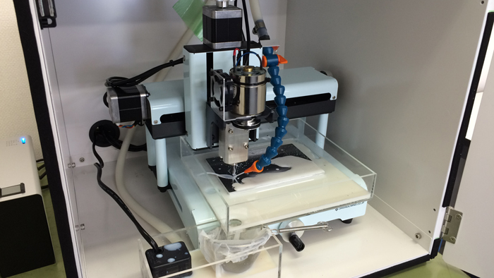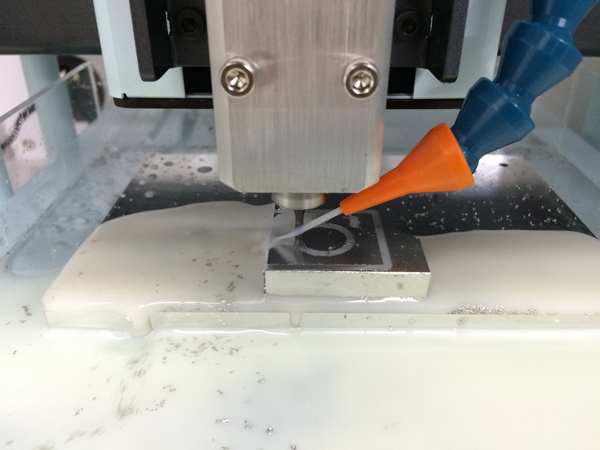 クーラント装置ができたので、試しに彫刻でエンブレムを製作しました。彫刻には、CAM:VCarve Desktopと刃物:彫刻カッターを使用しました。設定を間違えて、彫刻カッターの切り込み量を0.5mmに設定していましたが意外と削れました。