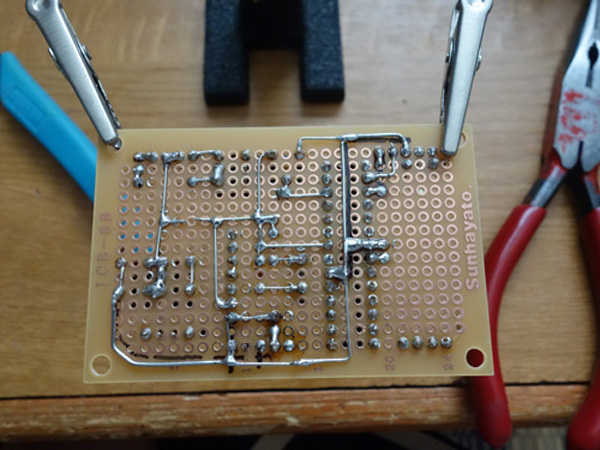 基板裏面、極力ビニール線が少なくなるよう心がけていますが、この後は視力と手先に自信のないビニール線の半田付けが待っています。