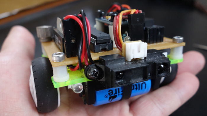 倒立振子はジャイロセンサーの機体角度信号をフィードバックして二輪車の倒立状態を保つという原理で、メカトロニクス分野のモノづくり愛好家には魅力のあるアイテムです。まったくの白紙状態から6か月、製作機数4台目にして「手のひらサイズ(重量130g、幅90㎜)」に成功しました。古希が近づいた視力、頭脳、震える手先に苦労しましたがネット上にも手のひらサイズの倒立振子は数少ないかと一人満足しております。倒立させるだけでは芸がないので距離センサーを追加して障害物から一定距離を保つような動きをいれてみました。オプションでワイヤレス化も試作しています。