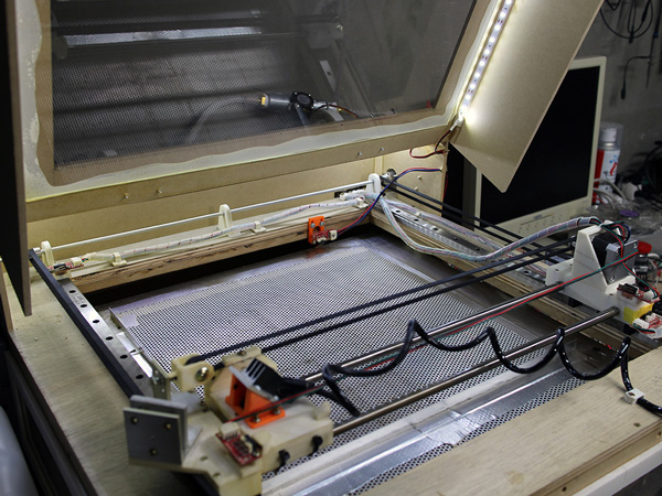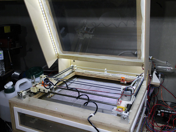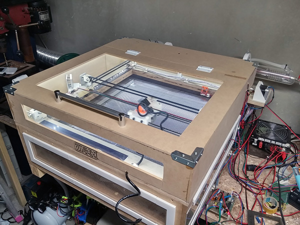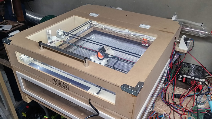 以前より欲しかったレーザー加工機ですが、金額的に個人で手が届く範囲にありませんでした、しかし自分で作るならなんとかなるのではないかと思い製作致しました。実際作ってみるとCNCなどと違い光は反力等を考慮する必要はありません、かつZ軸方向もレイヤー長が数ミリありますのでかなり適当に高さをあわせても切ってくれますので(レイヤー長、切削範囲とでも理解して下さい)十分アマチュアでも製作可能だと思います。ただ扱う電圧が15KV以上(電流は20mA程度ですが)、レーザー光を直視すると失明の恐れ有り等危険度はCNCなどよりかなりあると思われます。市販品との差額はほぼ安全の為だと思います。