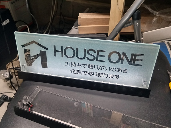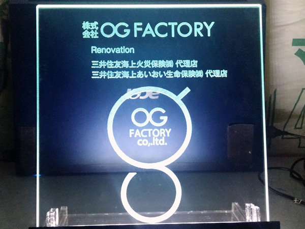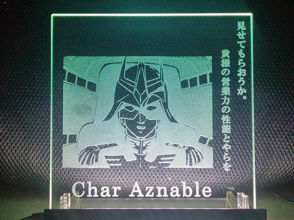 加工事例 ガラス彫刻(下側からLEDで光らせてあります、台座も加工)