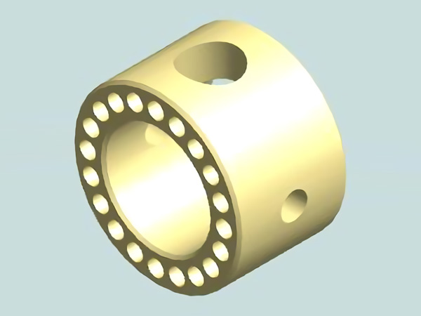 ABS製の毛を植毛するためのベース。内径はスピンドルの頭くらい、外径は細い方がいい。植毛するための穴(1.5mm)を可能な限り並べてある。横の穴でイモネジを使ってスピンドルに固定する。上の穴はスピンドルにエンドミルを固定する時のイモネジを操作する穴