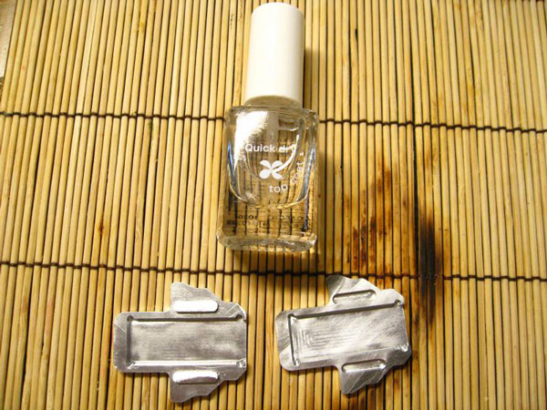 絶縁用にどこのご家庭にもあるトップコートを基板と触れ合う部分に塗布します。ついでに楕円形のパーツも圧入しました。