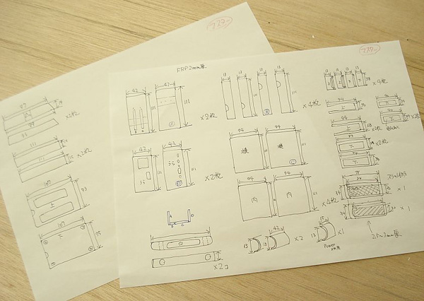 ダンボールの寸法を元に手書きの設計図を書いてから2mm厚のFRP板をカットしました。
