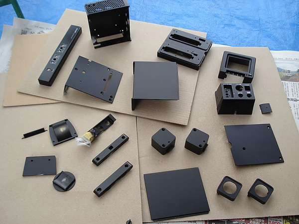 クルマ用の塗料とエアースプレーガンを使ってケースを艶消しのブラック梨地塗装をしました。表面が凸凹している梨地塗装は意外とスムーズに出来上がりましたが、艶消し剤の比率に苦労しました。