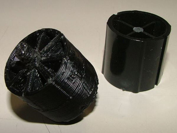 手前が3Dプリンタで印刷したテープカッターの軸の部品。