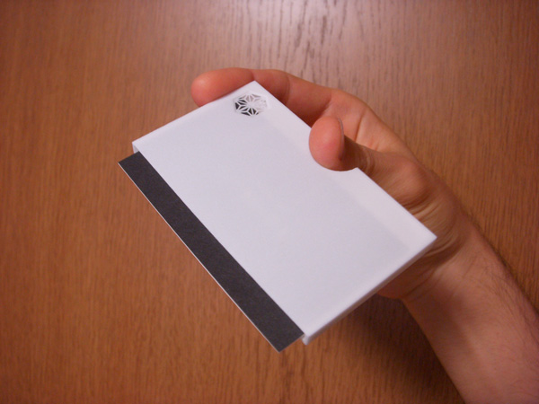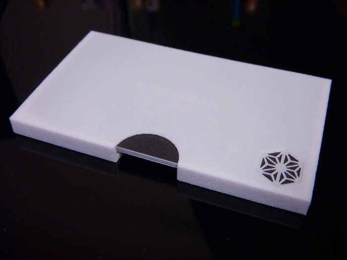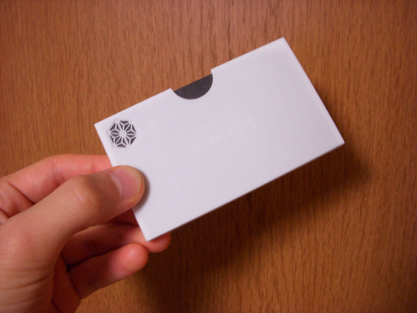 3Dプリンターで造形した名刺入れです。ナイロン(ポリアミド)で出力しています。内部に板ばねを造形し、その板ばねで収納した名刺を押さえつけています。蓋やボタンを必要とせず、名刺の出し入れが簡単です。