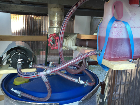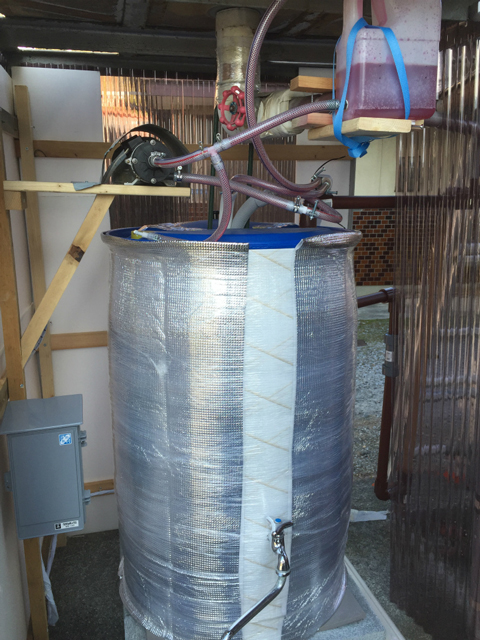 2次タンクに断熱材を巻き付けてできる限り保温して。タンクの中には銅管をループして作成したお手製の熱変換機が入ってます。熱交換機の取り付けに、アルミ線を使ってしまい、大失敗!!。アルミ線は温泉に簡単に溶けてしまうのですね。