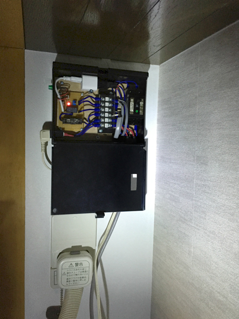 ファンコンベクターからの指令でポンプを稼働しますが、こちらが中継するコントローラー。といっても、中身はとても簡単な構造です。安全のため、ELBも取り付けてあります。