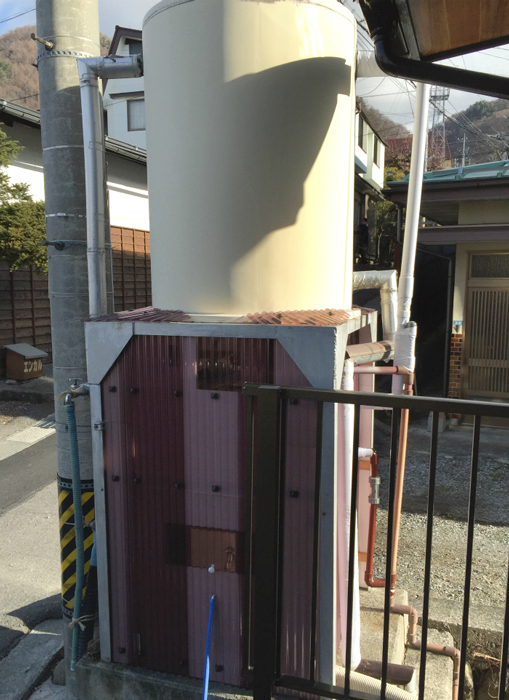写真は、温泉タンクと2次タンクを設置してある場所です。2次タンクは波板で囲ってあります。