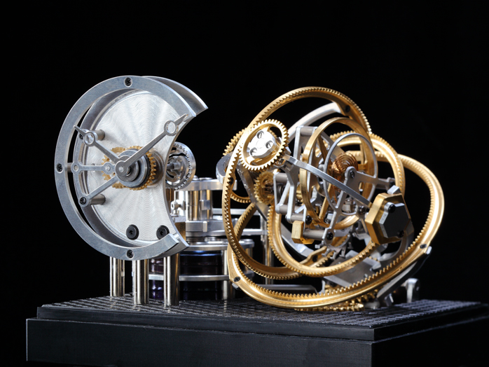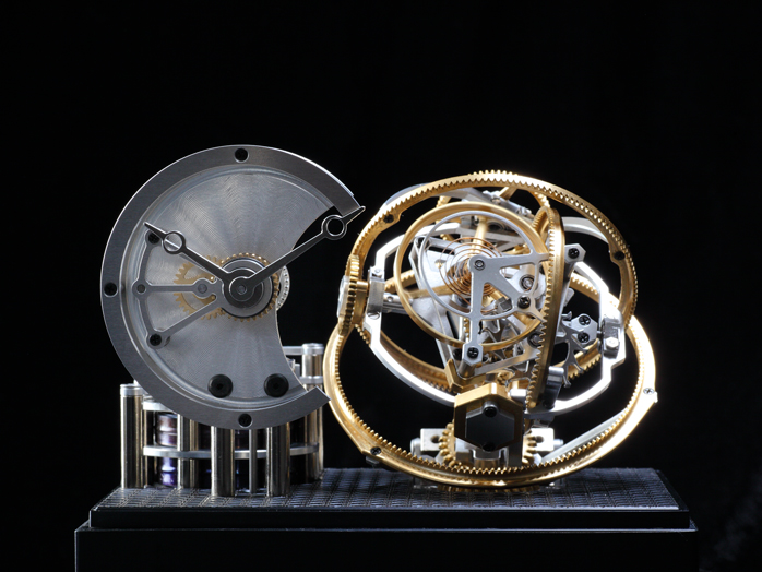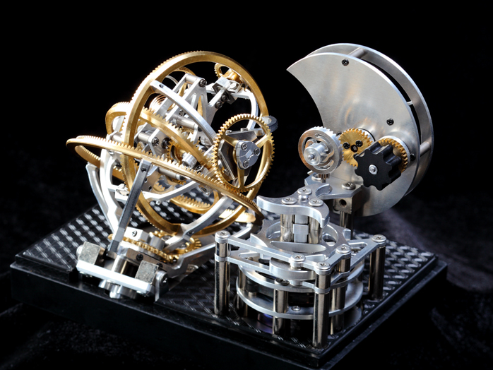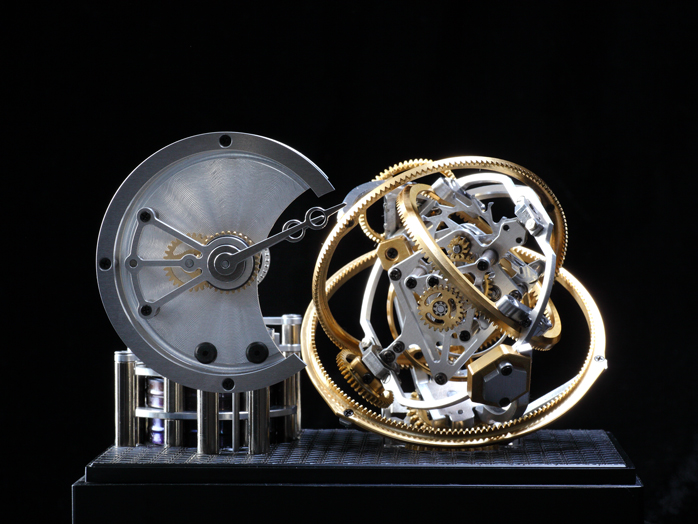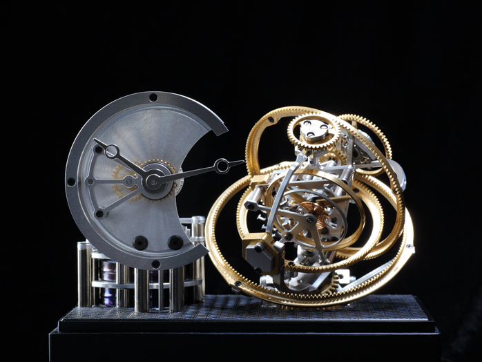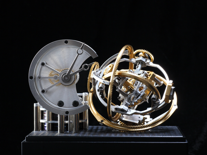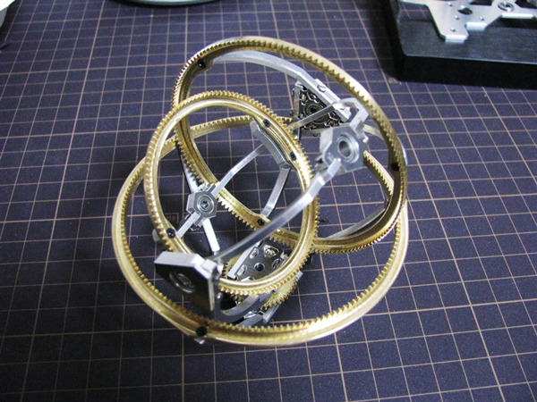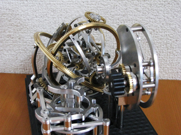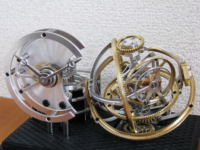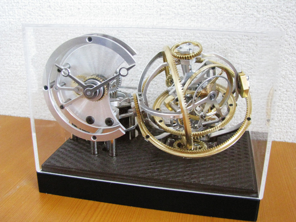 3軸(3D)トゥールビヨンの置時計を作りました。1軸トゥールビヨンに文字板を連動させて時計にしてもよいのですが、機構的な動きとしては3軸の方がずっとおもしろいだろうというのがありました。またKitMillの使い方にも慣れてきたこともあり、製作出来そうな目途が立ちましたのでトライしてみました。