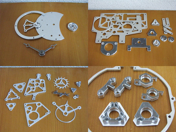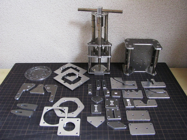 今回使った治具一式です。治具を出来るだけ少なくするように設計はしていたのですが、それでも形状が複雑な分、本体同等のボリュームになっています。(なお中央がプレス治具、右奥が垂直穴加工用の治具です)