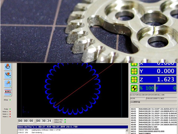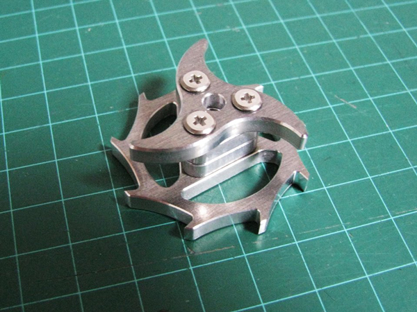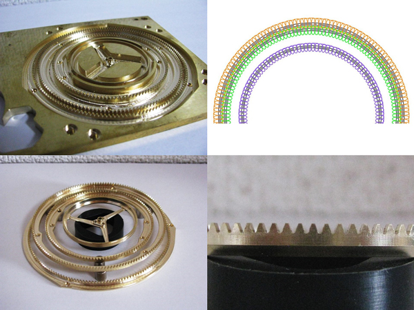 3軸トゥールビヨンの心臓部とも言える3つの巨大なリングギヤです。切削パスは手書きにて書いています。これもKitMillで切り出しています。歯車強度も考え (と言うより、ピンカドの歯底は単純に嫌だったので)歯底にはΦ0.5の彫金用カッターでRを付けています。