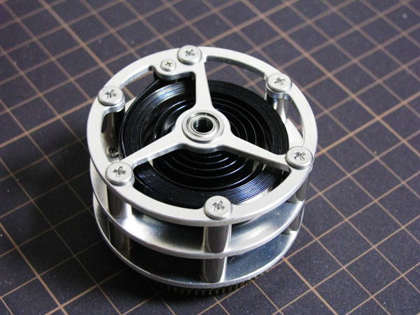 動力を蓄え、開放するためのゼンマイ(香箱)です。