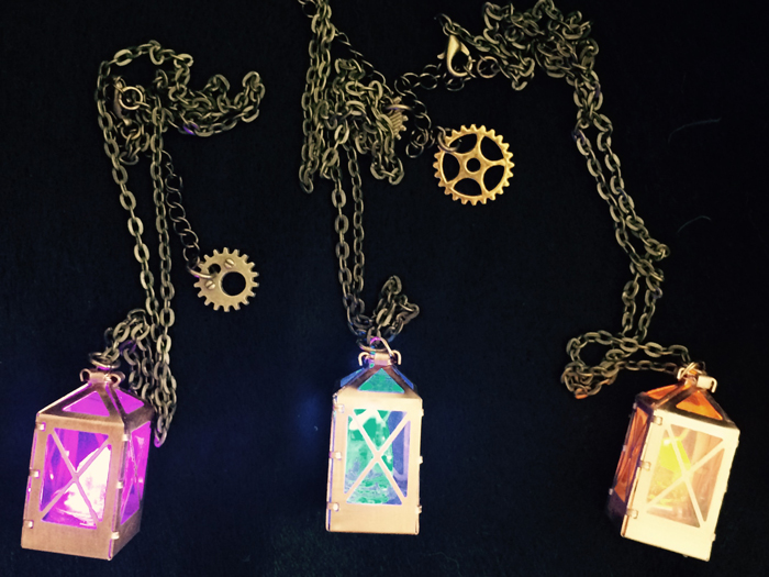 LEDをカンテラ部分に取り付けてカシメていきます。カンテラの枠部分はガラスっぽく加工しています。