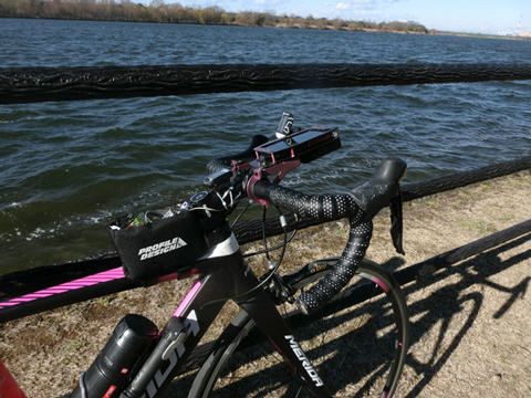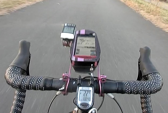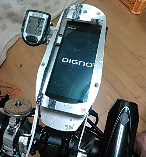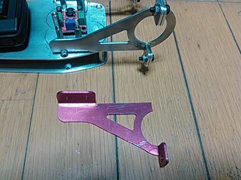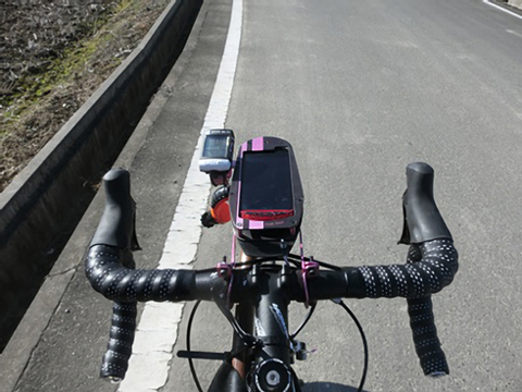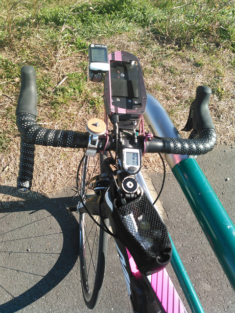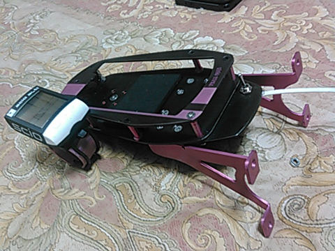 昨年つくったスマホホルダを新規設計で作り直しました。GPS・カメラ・スピードコントローラステイ・ライトの機能がつまっているので、いままでごちゃごちゃしていたハンドル周りがスッキリしました。ロードレーサー本体の色にあわせてみました。黒アルマイト後に二次加工してから、ピンクのアルマイトをしてみました。加工の工程を考えたり色合いの調整が大変でした。