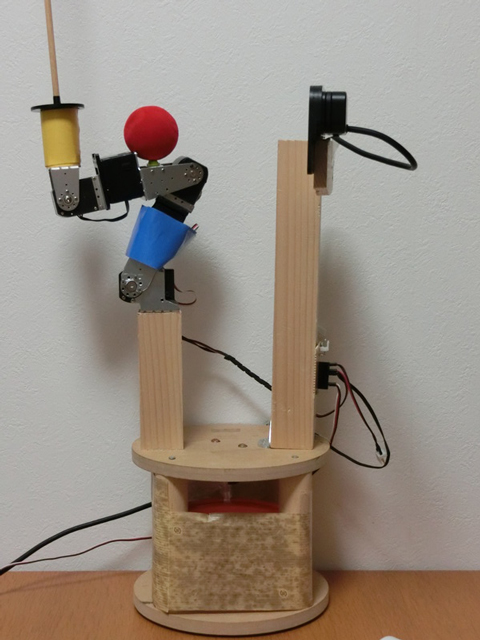 センサーとしてUSB接続の深度画像センサーを使用し、PC上で画像認識により標的の位置を求め、そこへ「竹刀」を当てるための経路を計算することで自律的に試合を行います。PCから直にロボット用シリアルサーボモーターへ指令を送ることで動作します。
