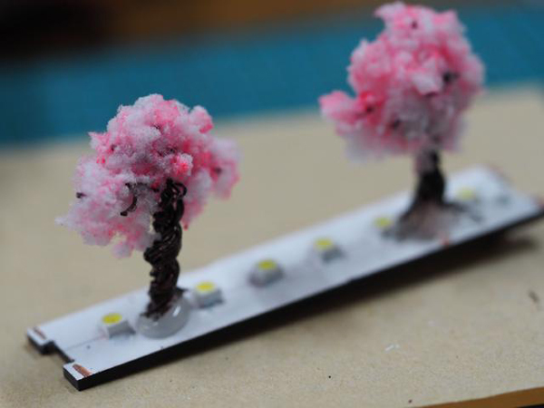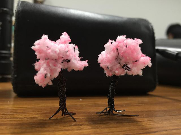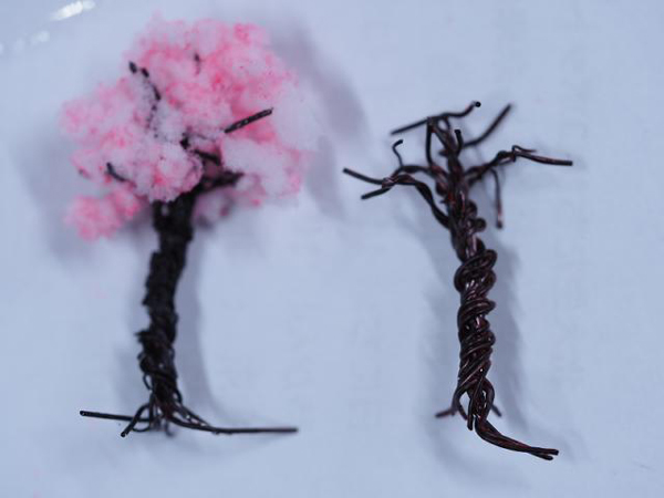 ジオラマの広葉樹作製情報を参考に、桜の木は針金を捻じ曲げて赤と黒のラッカーで塗装。