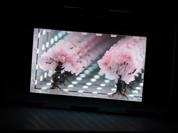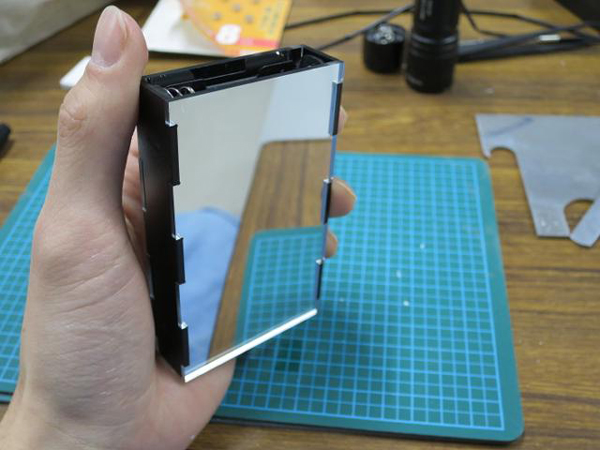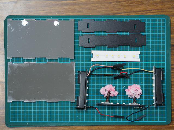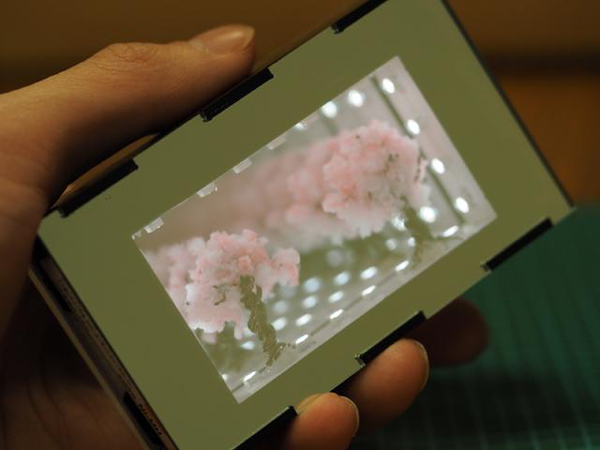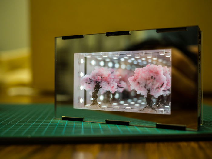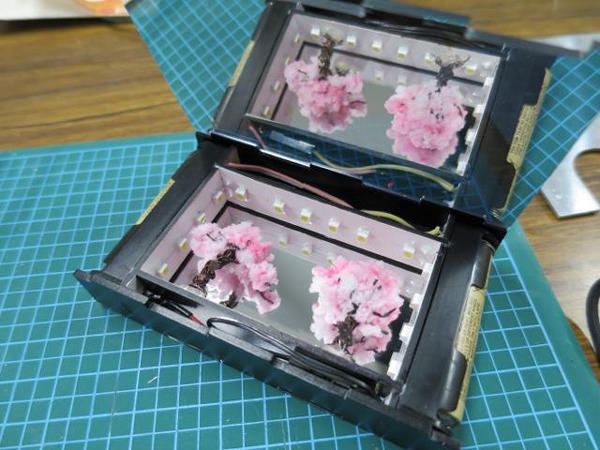 2015年の紅白歌合戦に千本桜が歌われると聞いたので、「奥深いネクタイ」に続き、合わせ鏡で桜の並木を作ってみました。手のひらに乗るサイズがいいなと考えていたところ、単4電池が名刺サイズ(91mm x 55mm)にピッタリだったので、そのサイズに収めてみました。(ギリギリでした)