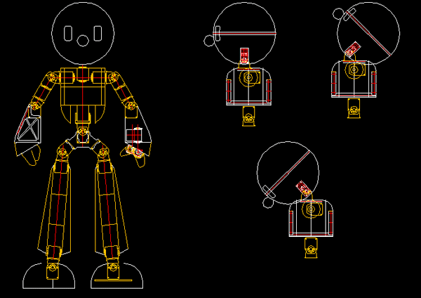 まず、予算と納期を解決するため、これまで使った経験のある市販のロボット用サーボモータとコントロールボードを採用した。次に、大きいロボットという要望には、印象を大きく見せる工夫で解決した。頭、手、足を大きくし、離れて見ても存在感のあるデザインにした。
